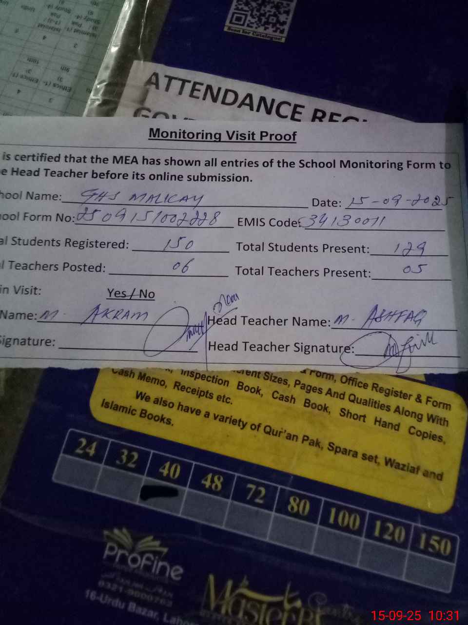 | Attendance Register | Head Teacher | MEA with School | Visit Proof |