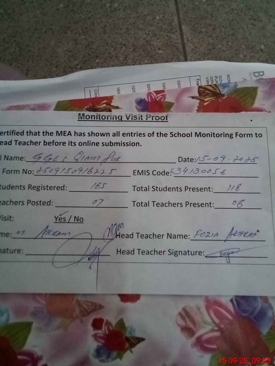 | Attendance Register | Head Teacher | MEA with School | Visit Proof |