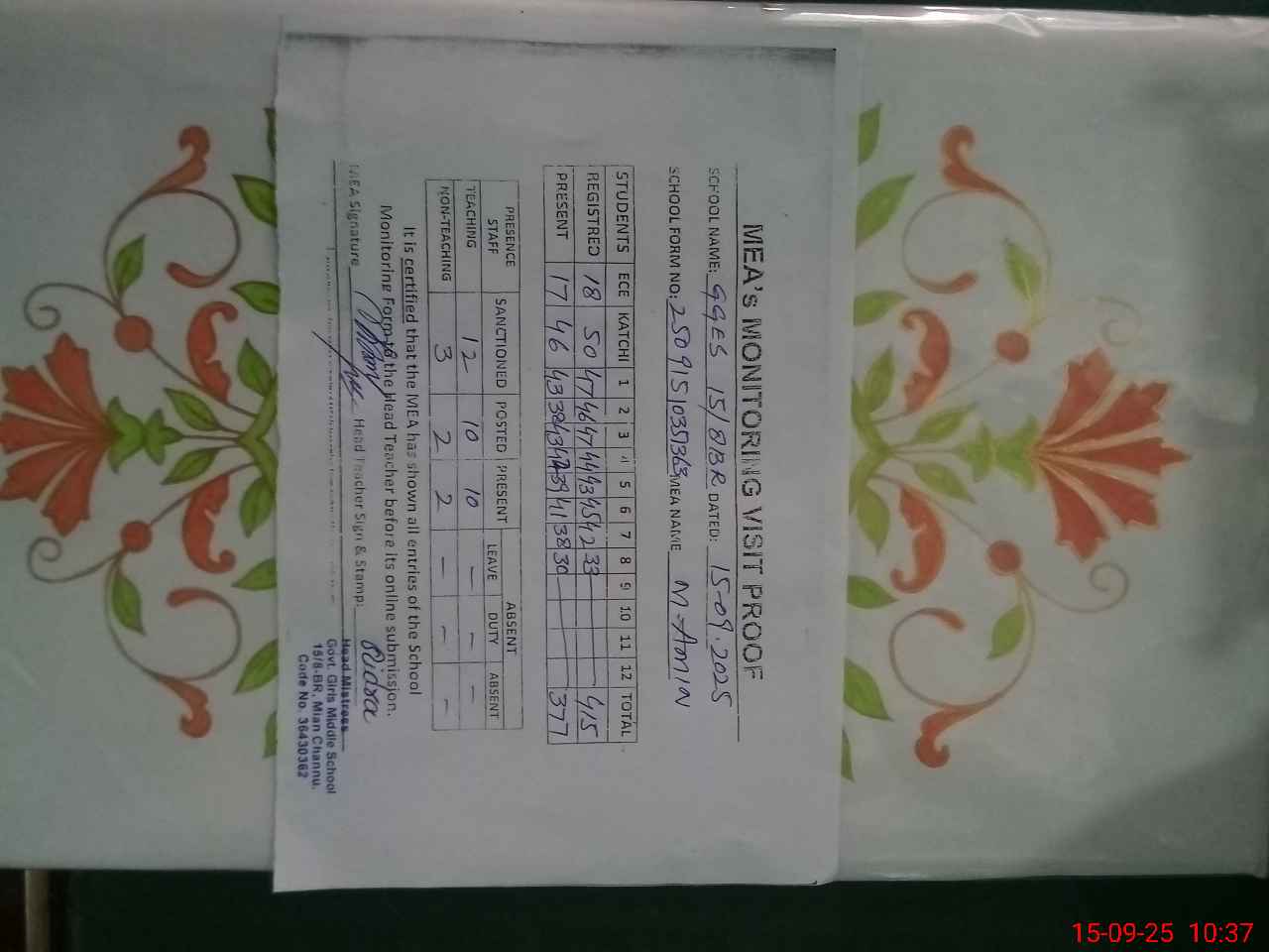 | Attendance Register | Head Teacher | MEA with School | Visit Proof |