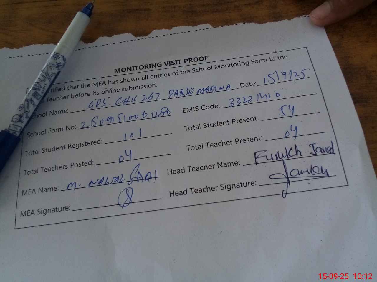 | Attendance Register | Head Teacher | MEA with School | Visit Proof |