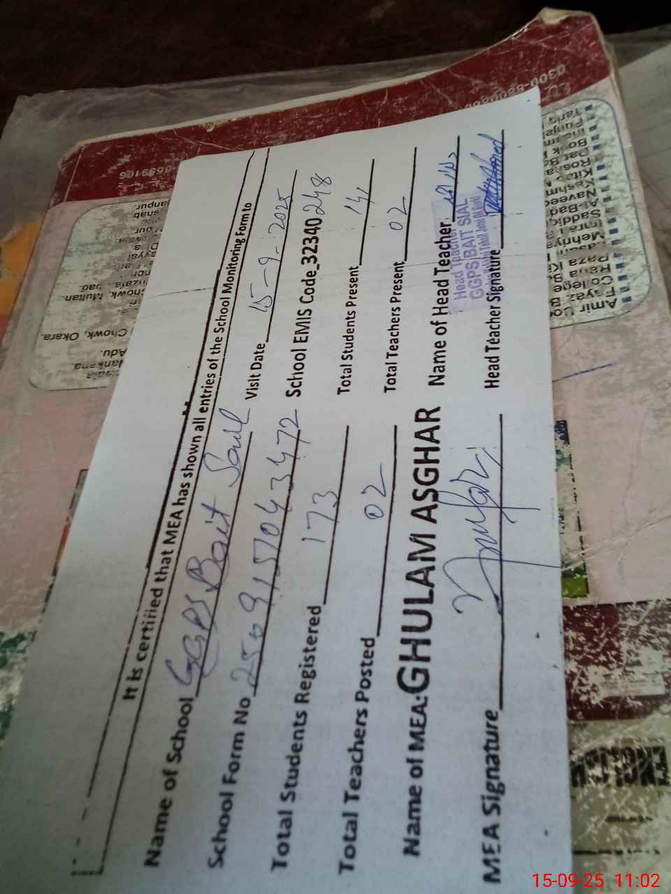 | Attendance Register | Head Teacher | MEA with School | Visit Proof |