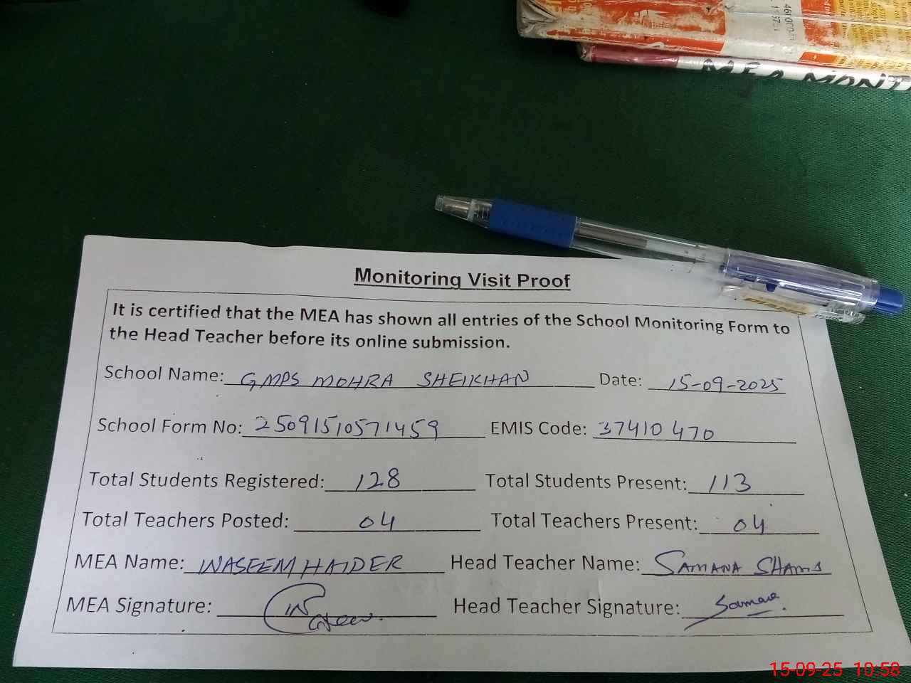 | Attendance Register | Head Teacher | MEA with School | Visit Proof |