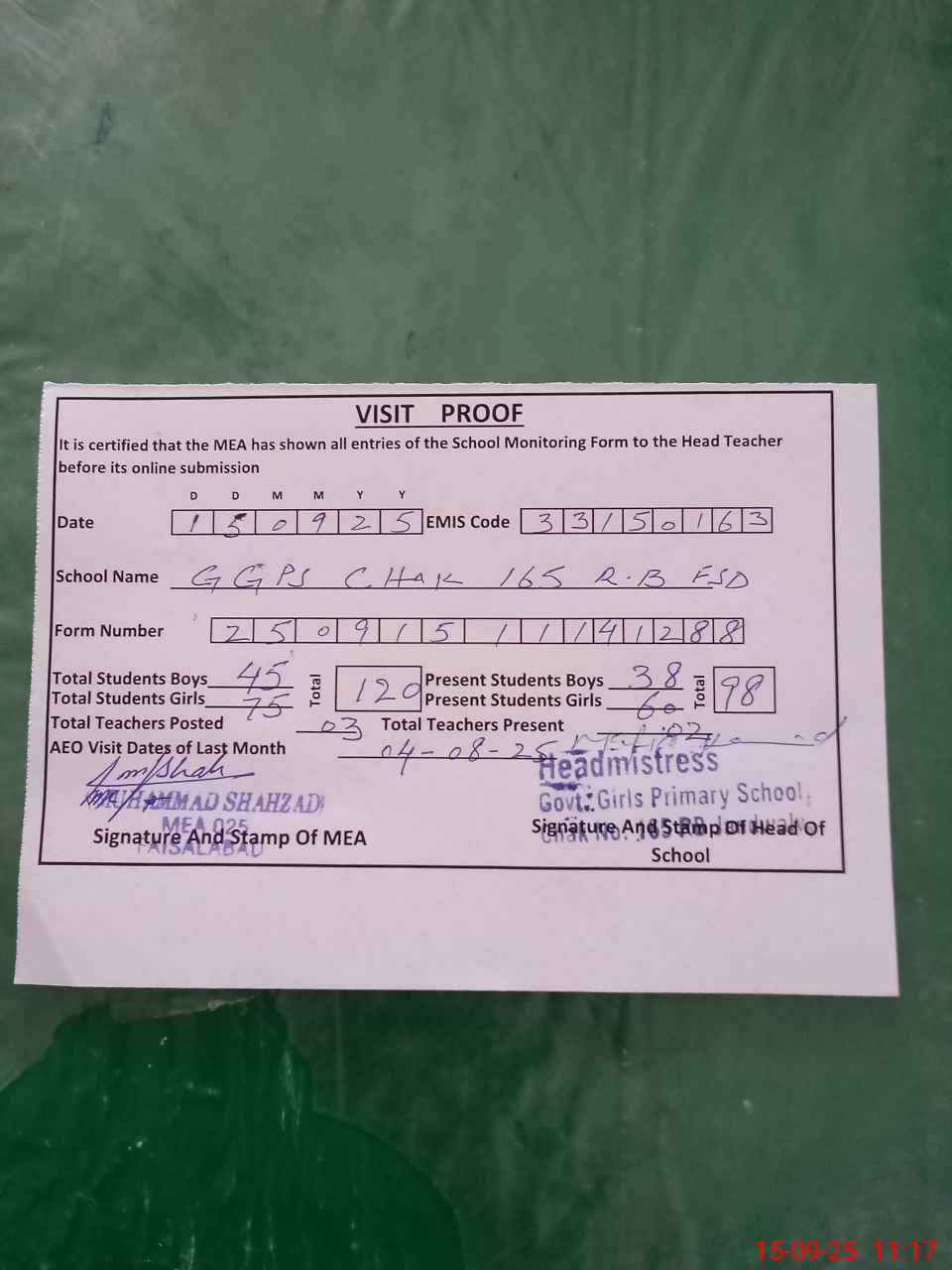 | EMIS Code: 33150163 | Name of School: GGPS CHAK 165 RB | |||