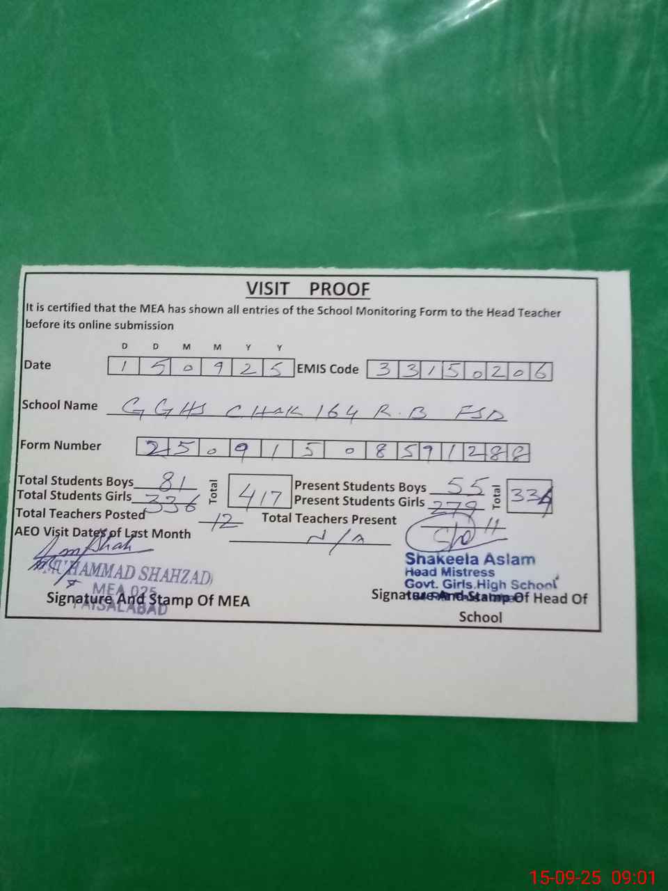 | EMIS Code: 33150206 | Name of School: GGHS CHAK 164 RB | |||