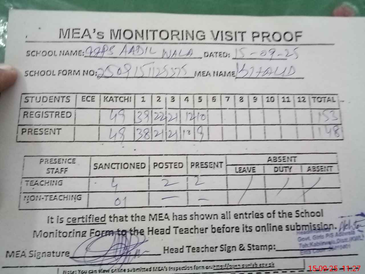 | Attendance Register | Head Teacher | MEA with School | Visit Proof |