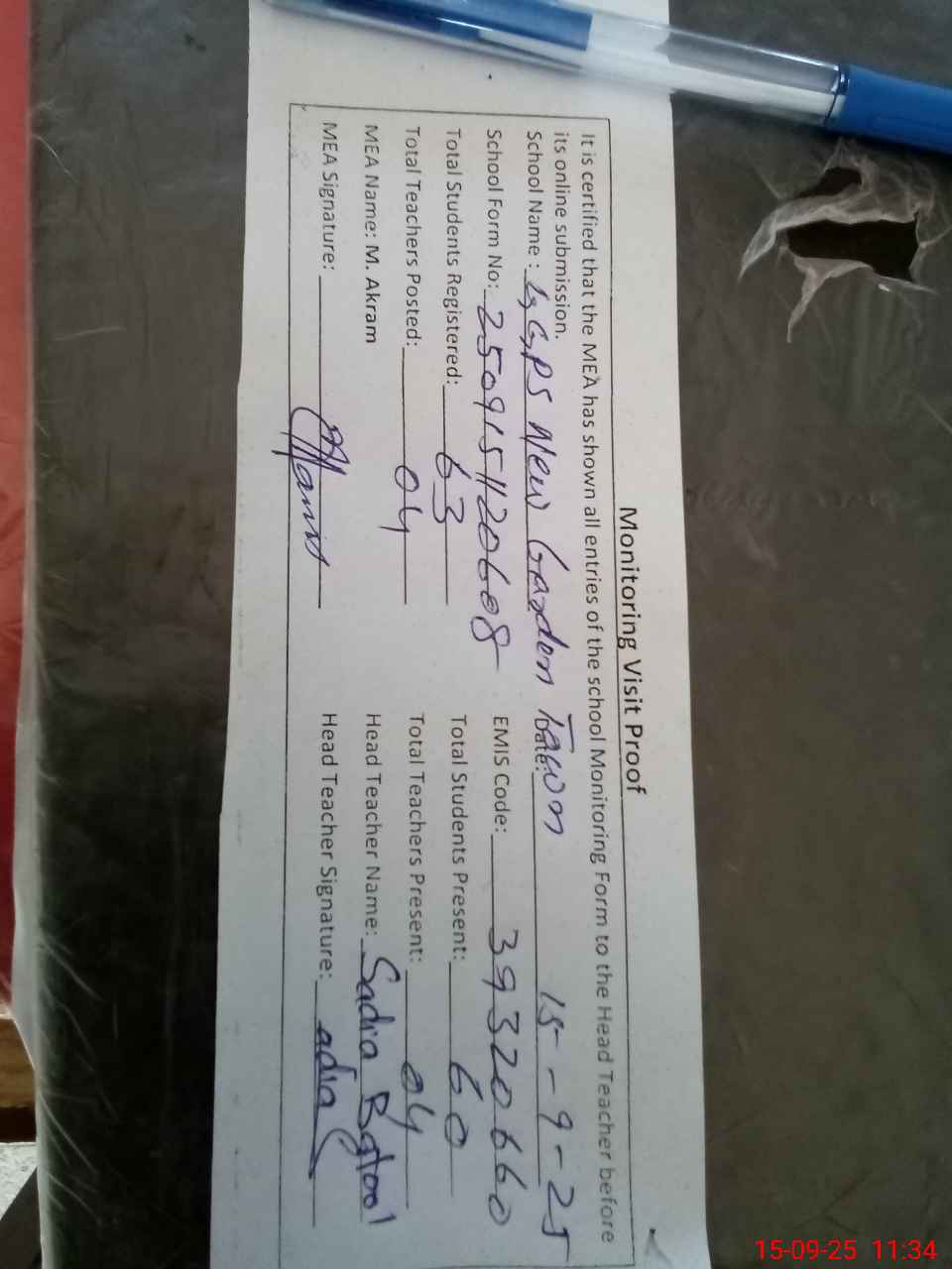 | Attendance Register | Head Teacher | MEA with School | Visit Proof |