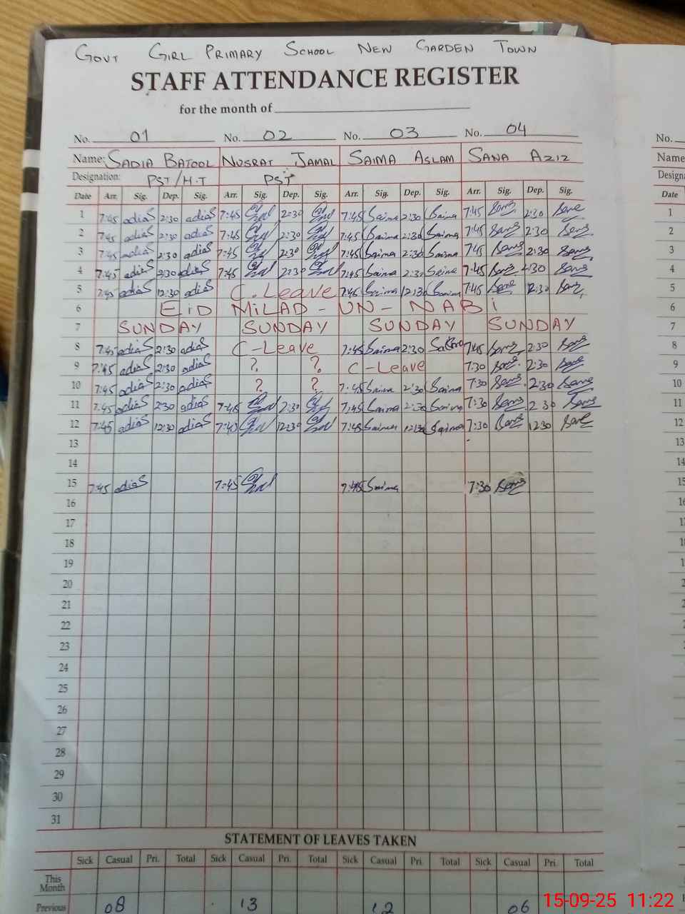 | CNIC | Full Name | Designation | R/C | Absence During Last Calender Month |