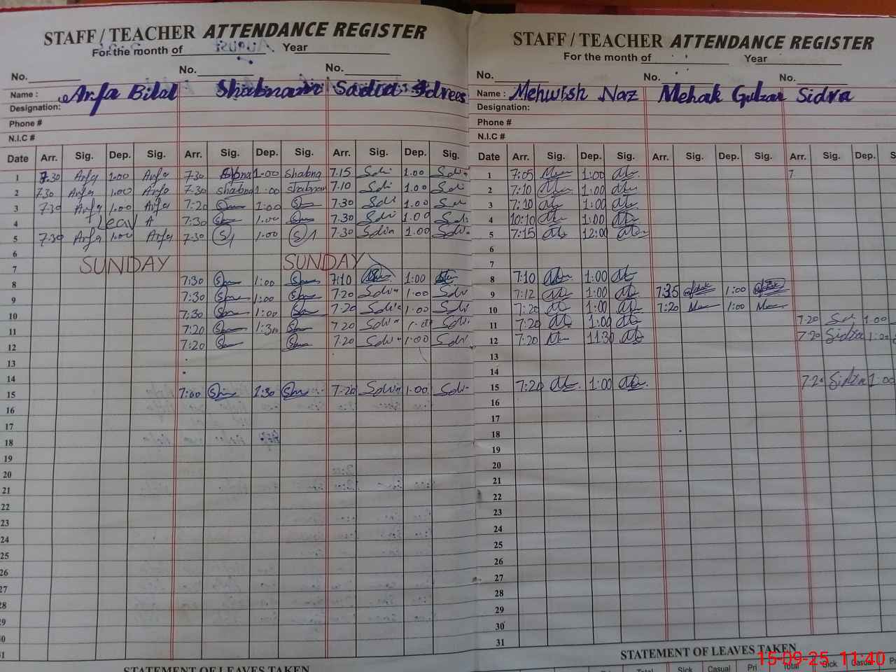 | CNIC | Full Name | Designation | R/C | Absence During Last Calender Month |