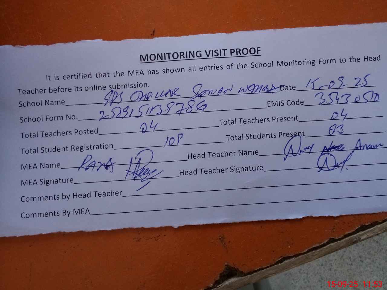 | Attendance Register | Head Teacher | MEA with School | Visit Proof |