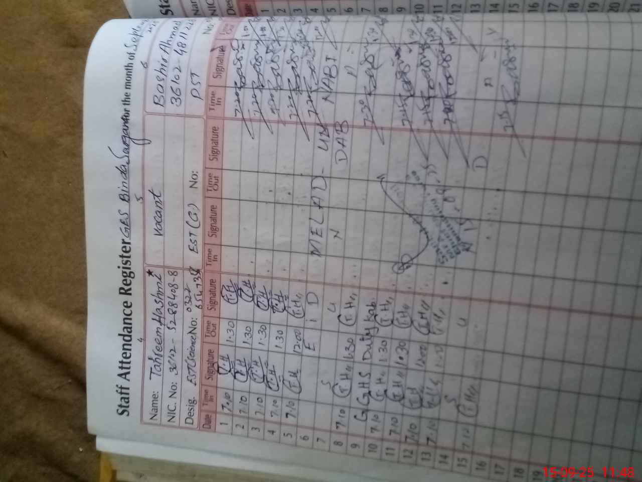 | CNIC | Full Name | Designation | R/C | Absence During Last Calender Month |