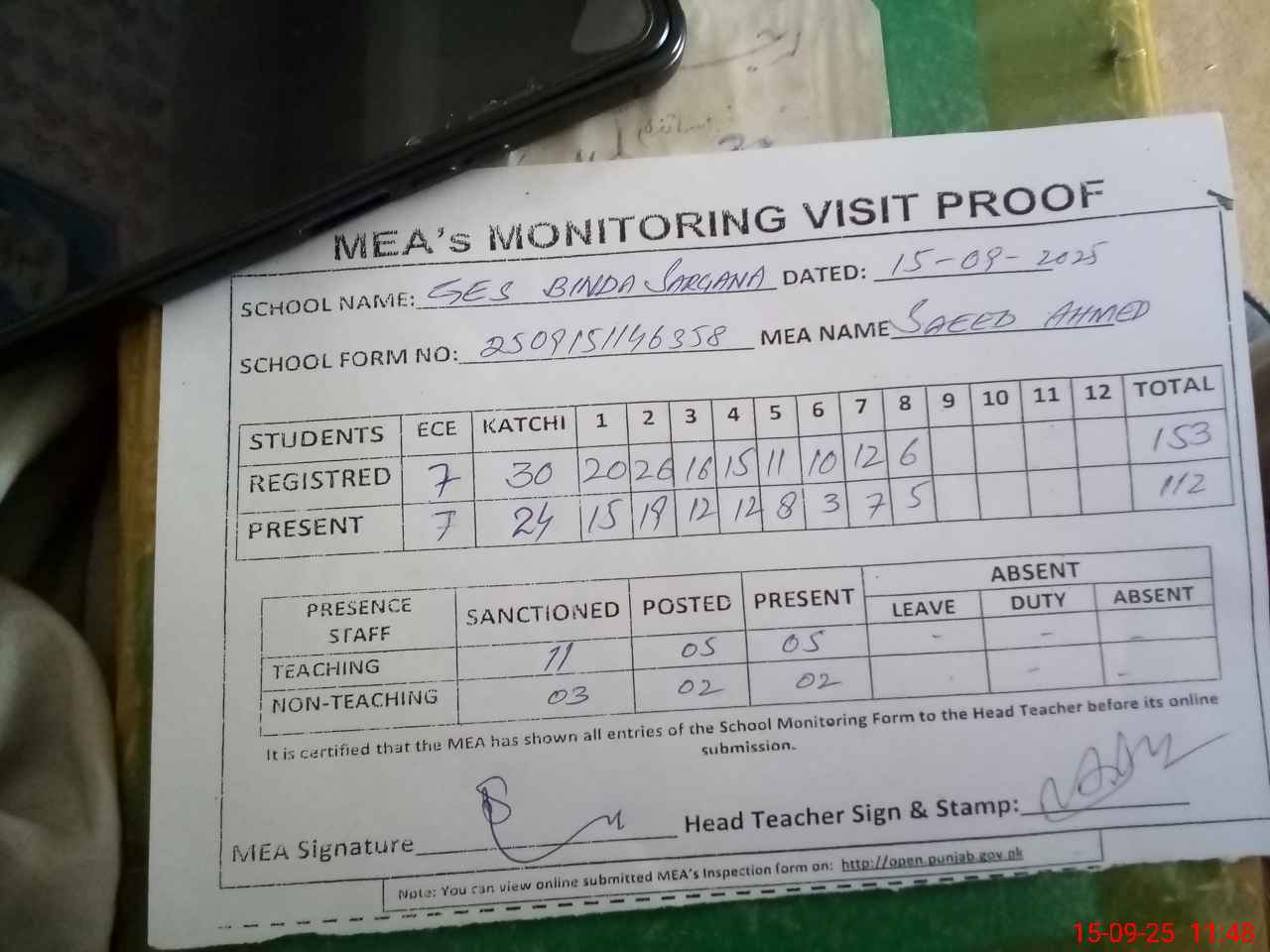 | Attendance Register | Head Teacher | MEA with School | Visit Proof |
