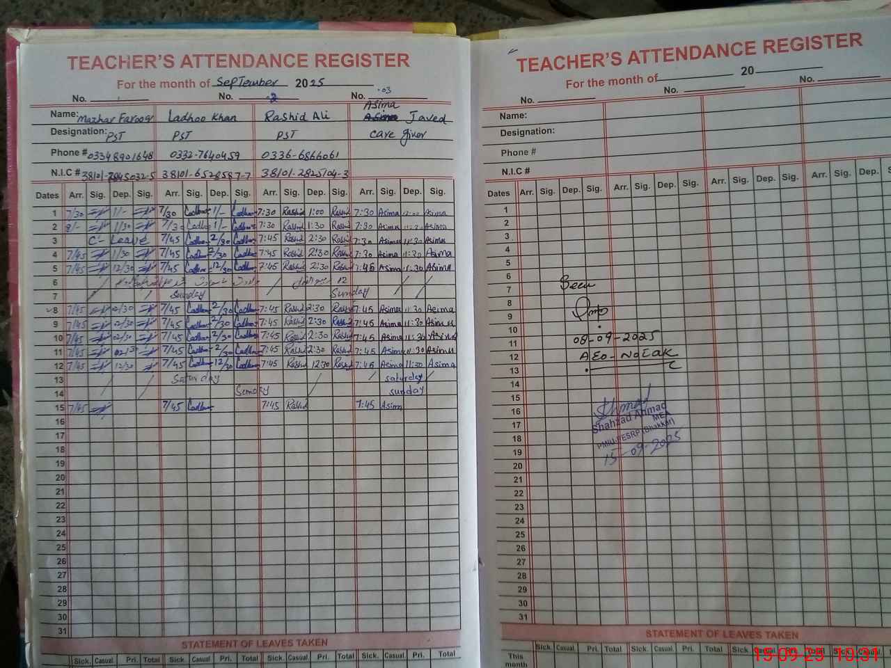 | CNIC | Full Name | Designation | R/C | Absence During Last Calender Month |
