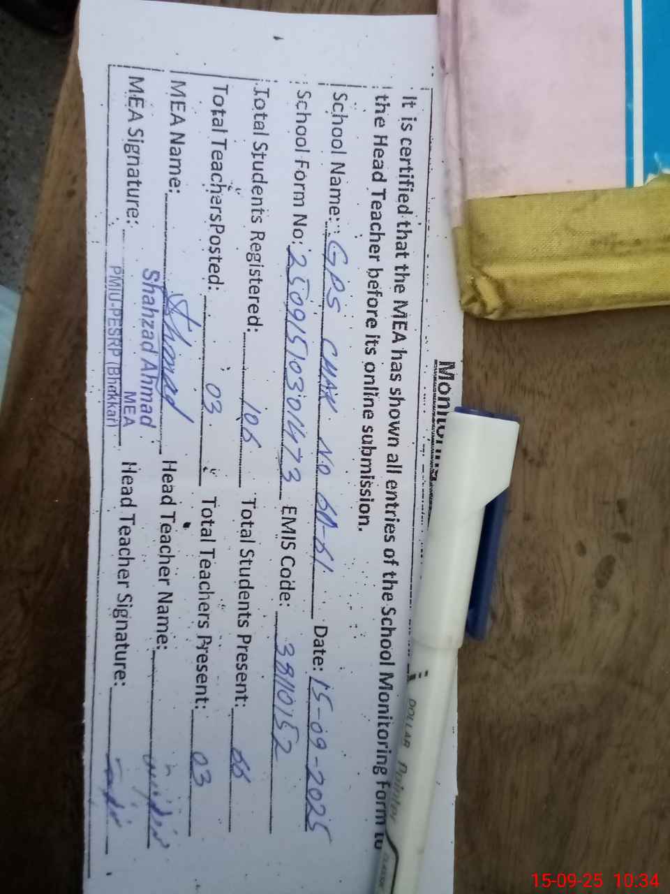 | Name: M.MA**** FA**** Designation: (School Headmaster's/Headmistress's) PTC/JV Phone/Cell Number: 03**** |