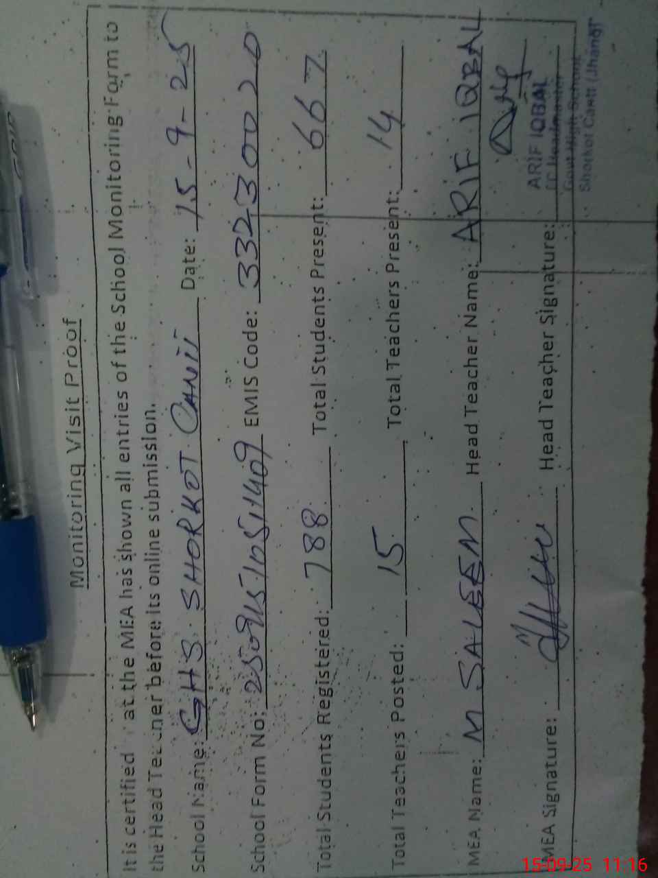 | Name: AR**** IQ**** Designation: (School Headmaster's/Headmistress's) Incharge HEADMASTER Phone/Cell Number: 03**** |