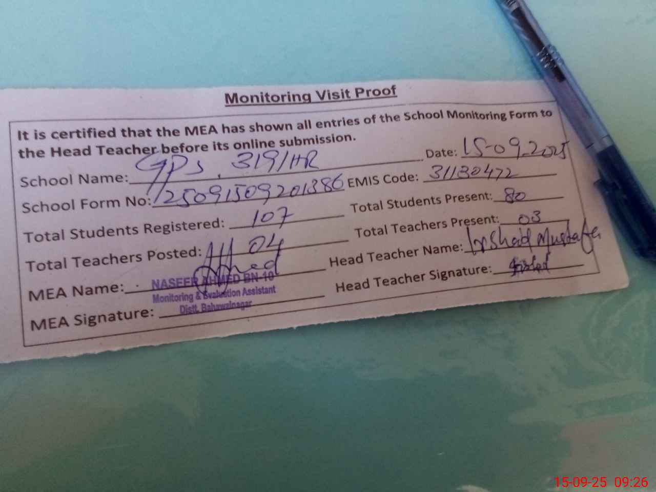 | EMIS Code: 31130472 | Name of School: GPS CHAK NO 319/HR | |||