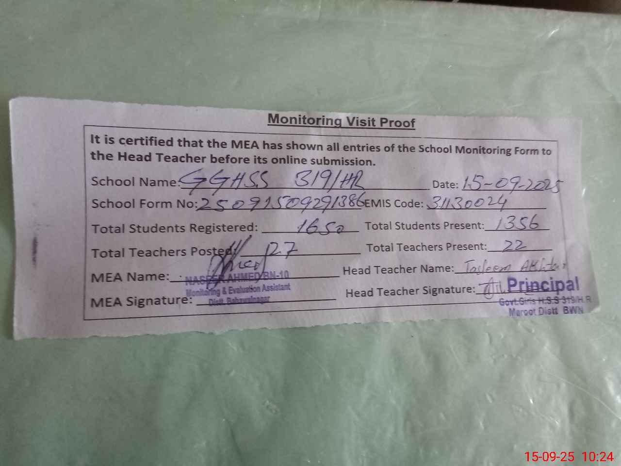 | Attendance Register | Head Teacher | MEA with School | Visit Proof |