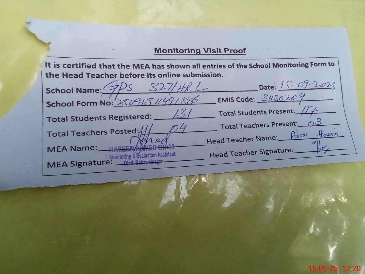| EMIS Code: 31130209 | Name of School: GPS CHAK NO.327/HRL | |||