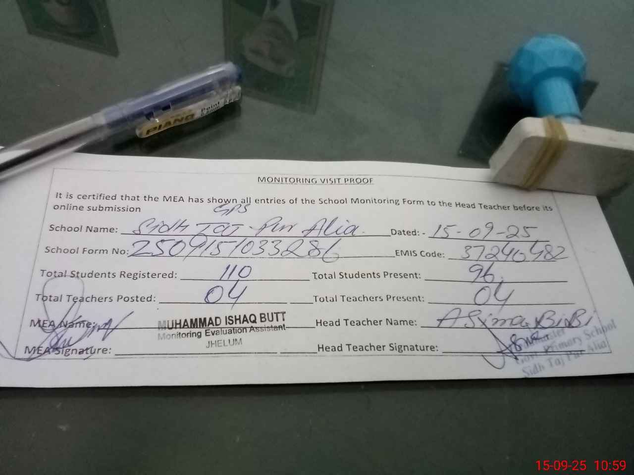 | Attendance Register | Head Teacher | MEA with School | Visit Proof |