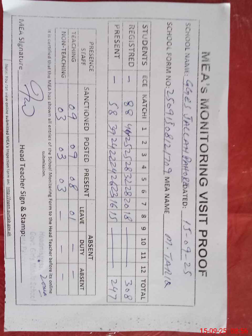 | Attendance Register | Head Teacher | MEA with School | Visit Proof |