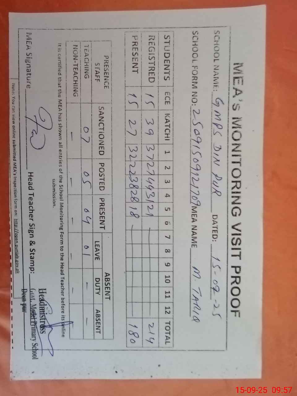 | Attendance Register | Head Teacher | MEA with School | Visit Proof |