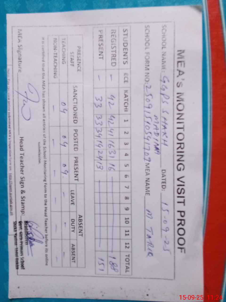 | Attendance Register | Head Teacher | MEA with School | Visit Proof |