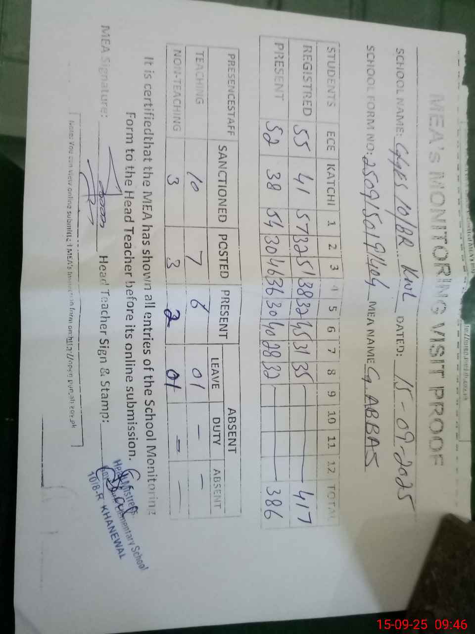 | Monitoring Date: 15-09-2025 | Start Time: 15-09-2025 08:14 AM | End Time: 15-09-2025 09:47 AM | Name of MEA: GH**** AB**** | |