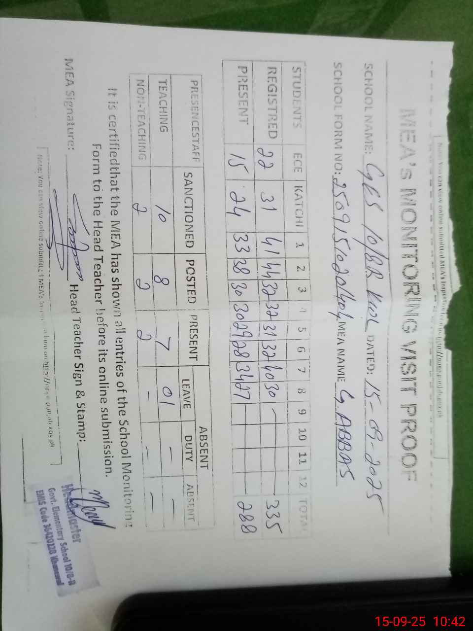 | Attendance Register | Head Teacher | MEA with School | Visit Proof |