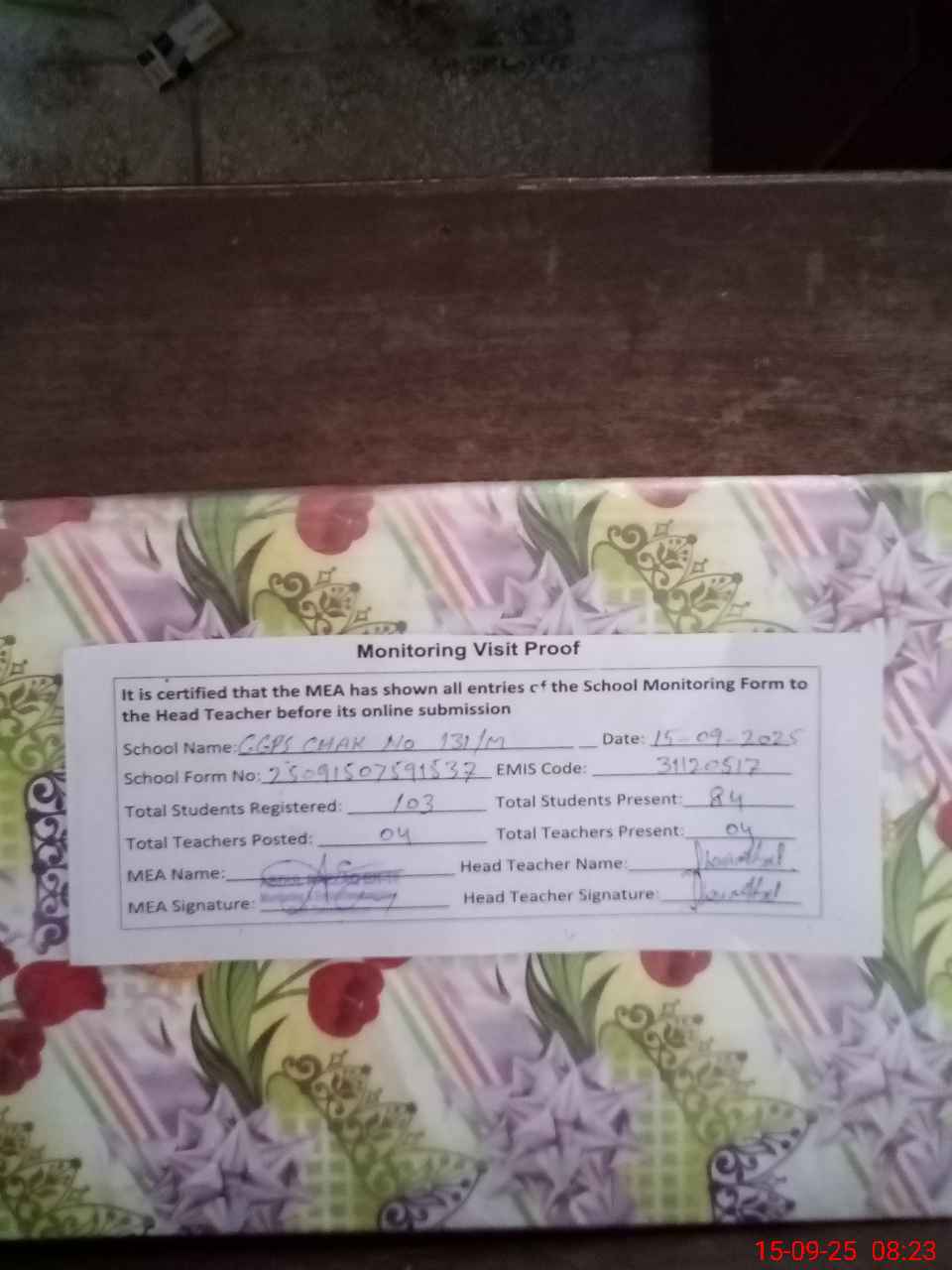| EMIS Code: 31120517 | Name of School: GGPS CHAK NO 131 MURAD | |||