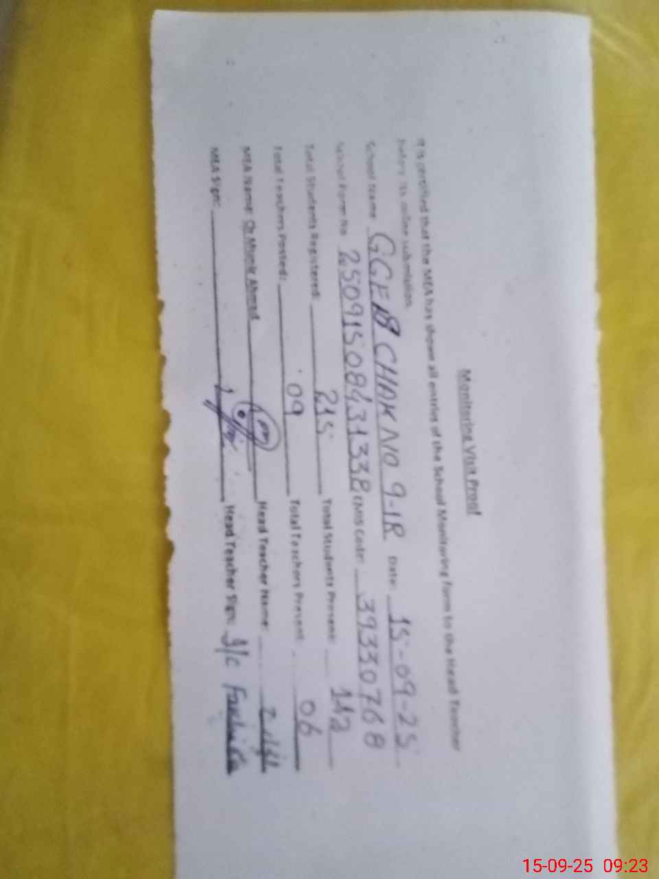 | Attendance Register | Head Teacher | MEA with School | Visit Proof |