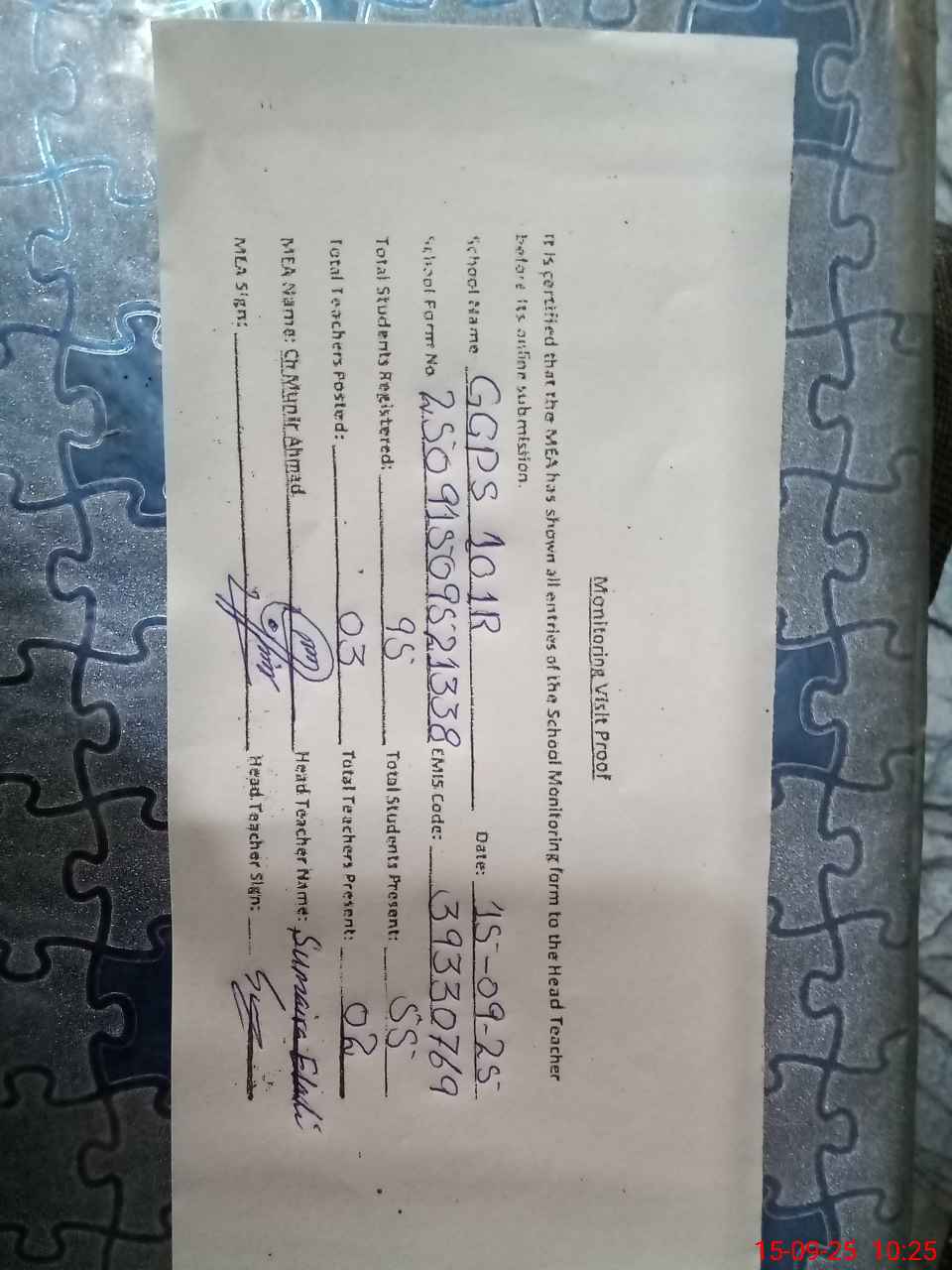| Monitoring Date: 15-09-2025 | Start Time: 15-09-2025 09:52 AM | End Time: 15-09-2025 10:26 AM | Name of MEA: MU**** AH**** | |