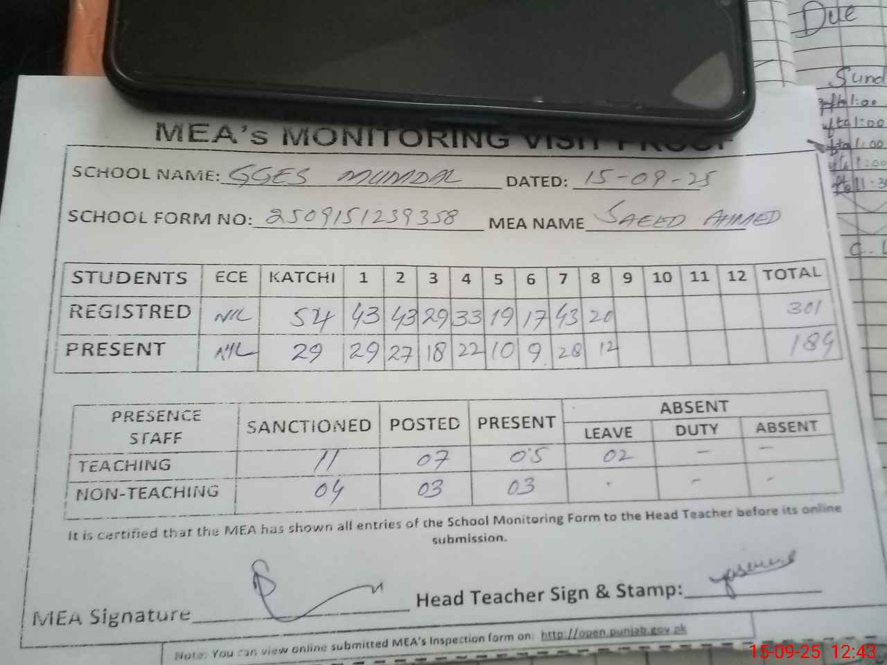 | Attendance Register | Head Teacher | MEA with School | Visit Proof |