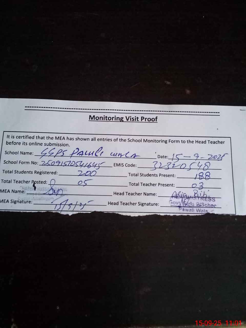| Attendance Register | Head Teacher | MEA with School | Visit Proof |