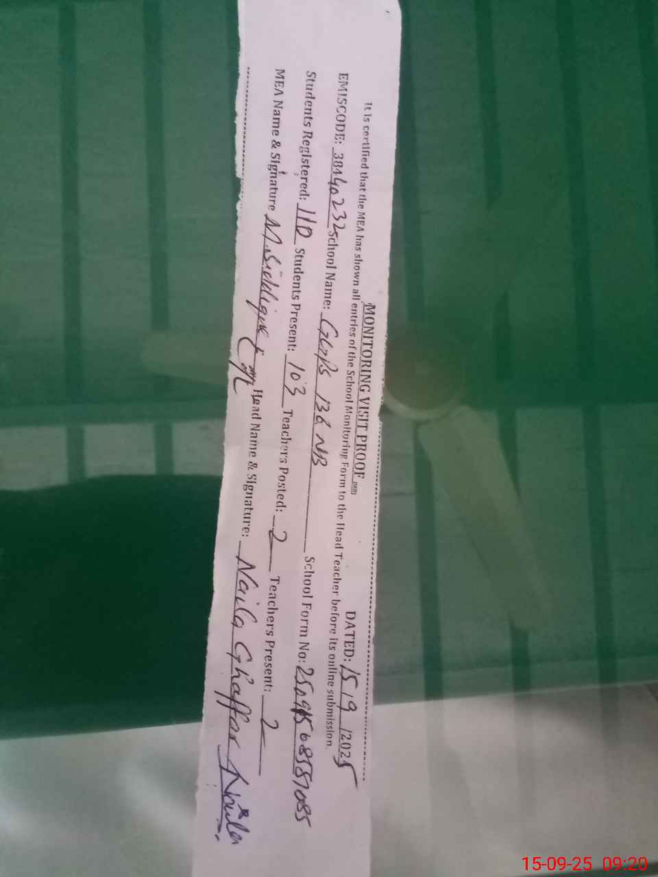 | Certified that this School was Inspected by the Undersigned MEA/DMO Today and the Information Stated Above is as Per Record. | |||||