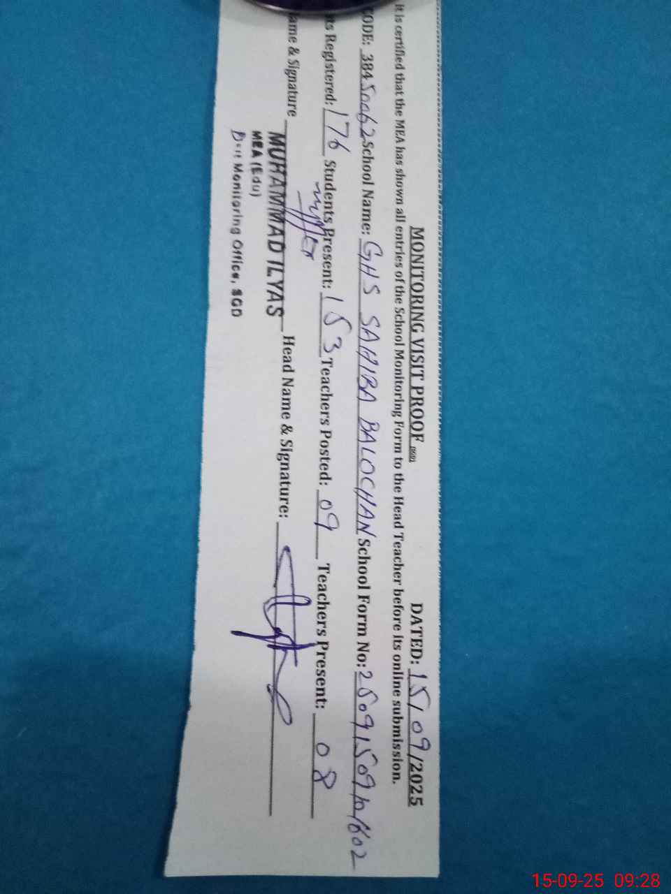| Attendance Register | Head Teacher | MEA with School | Visit Proof |