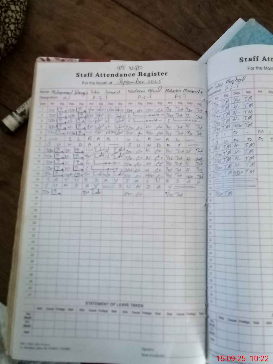 | CNIC | Full Name | Designation | R/C | Absence During Last Calender Month |