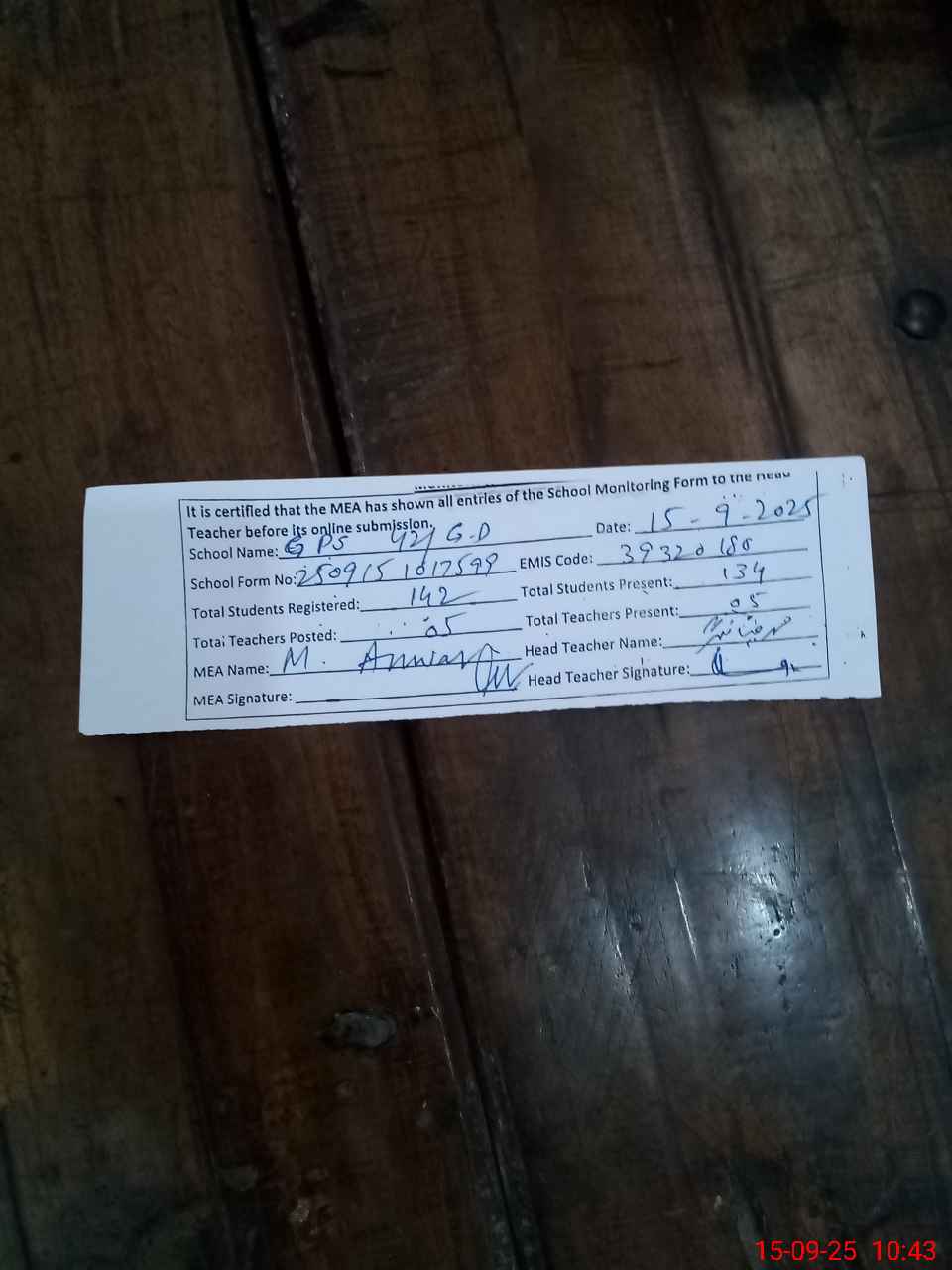 | Attendance Register | Head Teacher | MEA with School | Visit Proof |