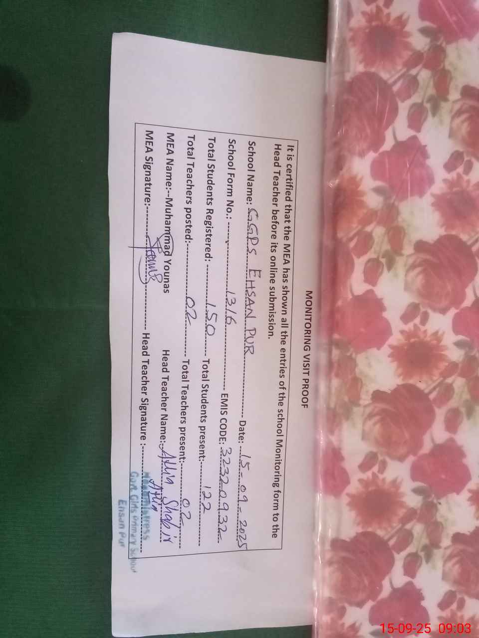 | EMIS Code: 32320932 | Name of School: GGPS EHSAN PUR | |||