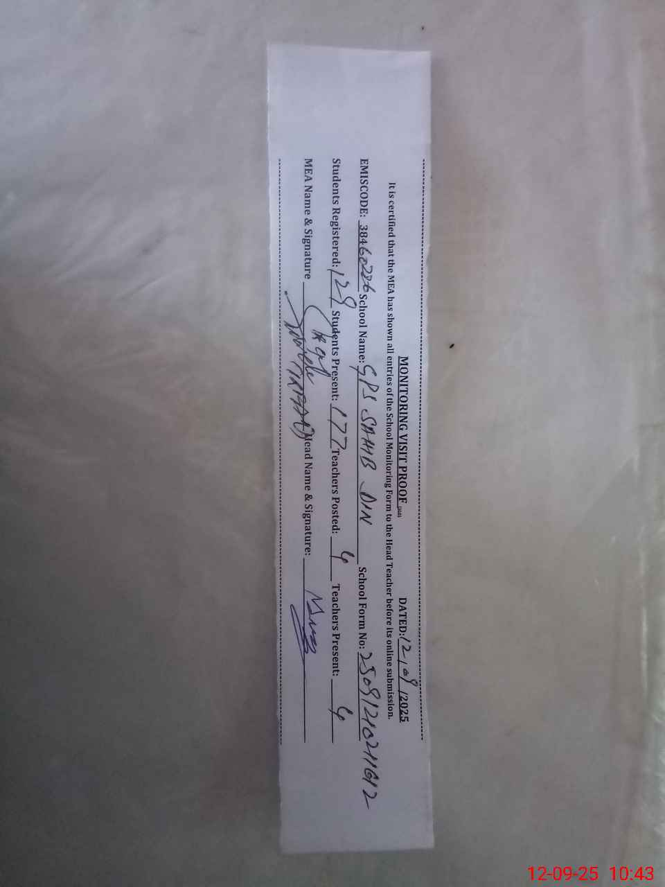 | Attendance Register | Head Teacher | MEA with School | Visit Proof |
