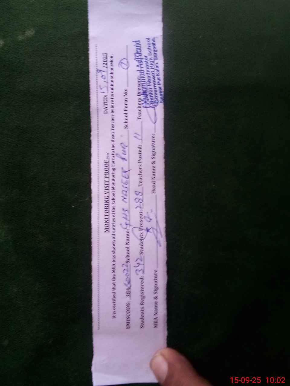 | Attendance Register | Head Teacher | MEA with School | Visit Proof |