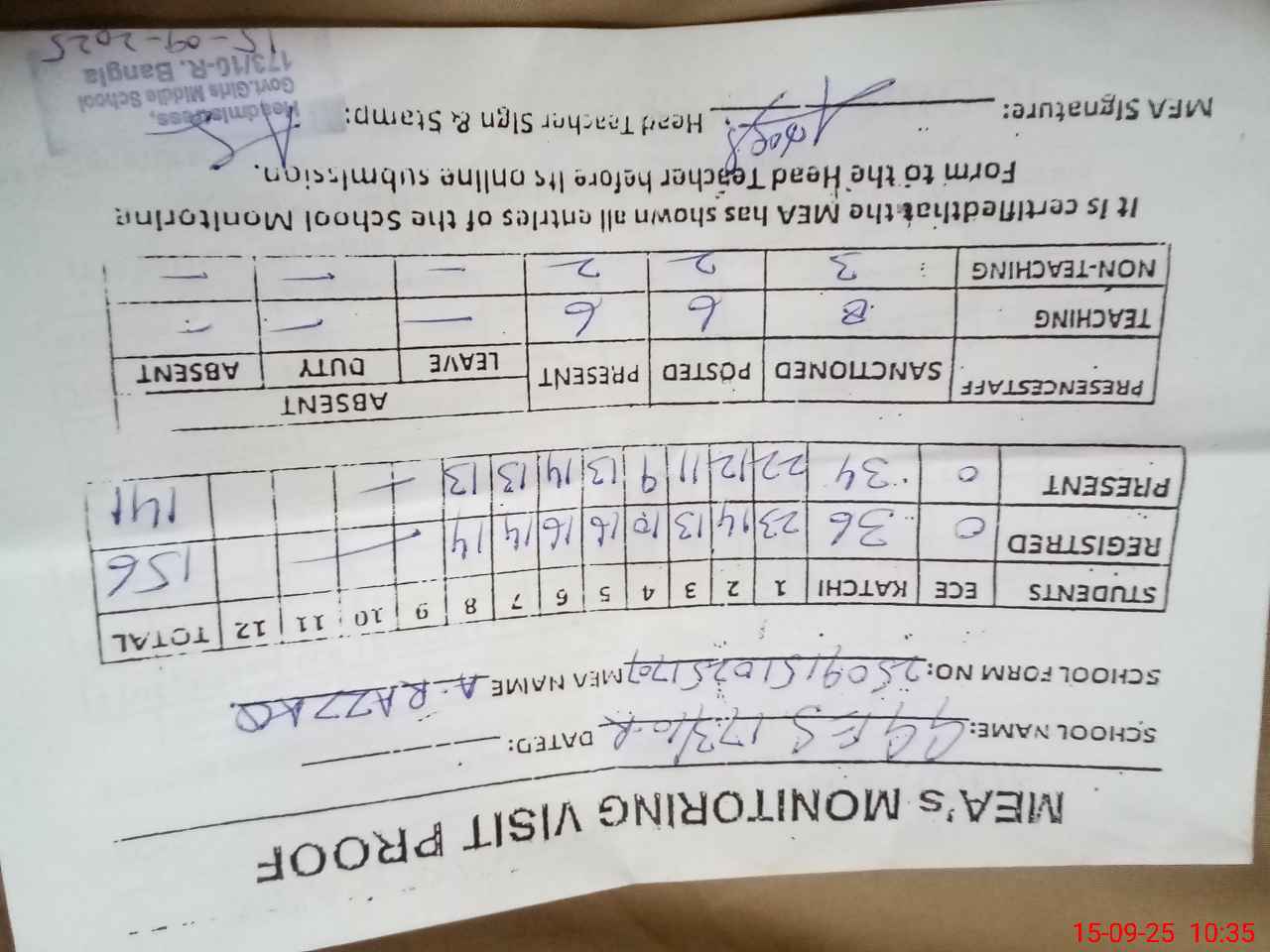 | Attendance Register | Head Teacher | MEA with School | Visit Proof |