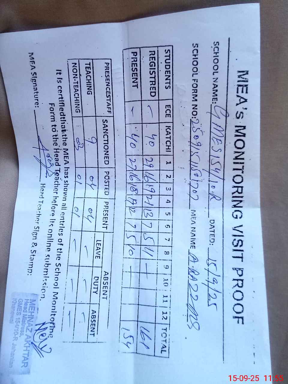 | Attendance Register | Head Teacher | MEA with School | Visit Proof |
