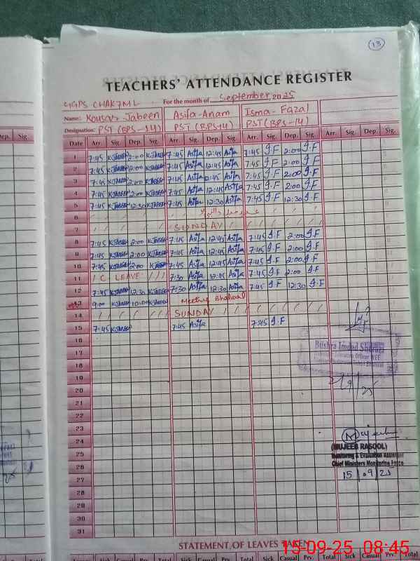 | Attendance Register | Head Teacher | MEA with School | Visit Proof |