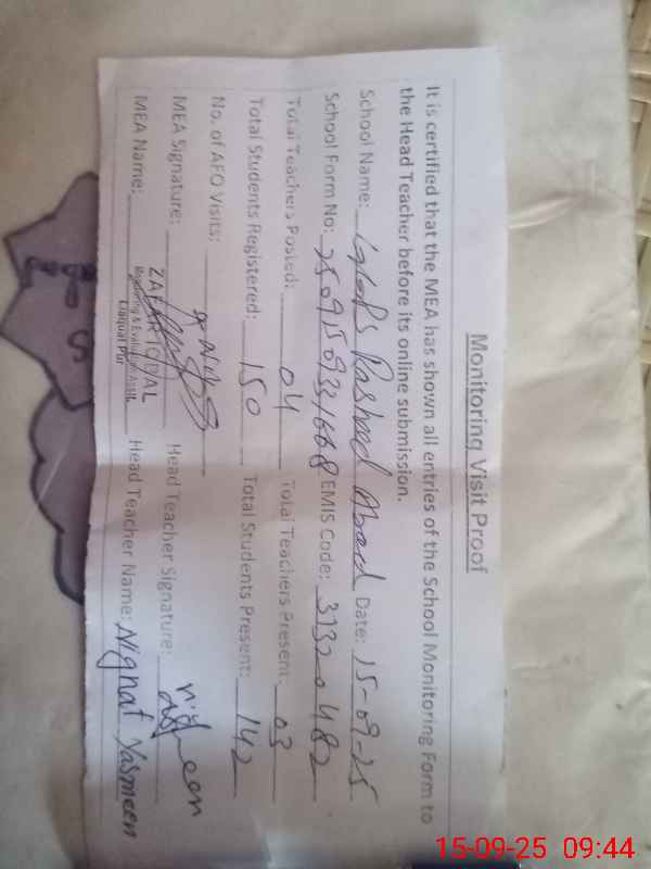 | EMIS Code: 31320482 | Name of School: GGPS RASHEED ABAD | |||