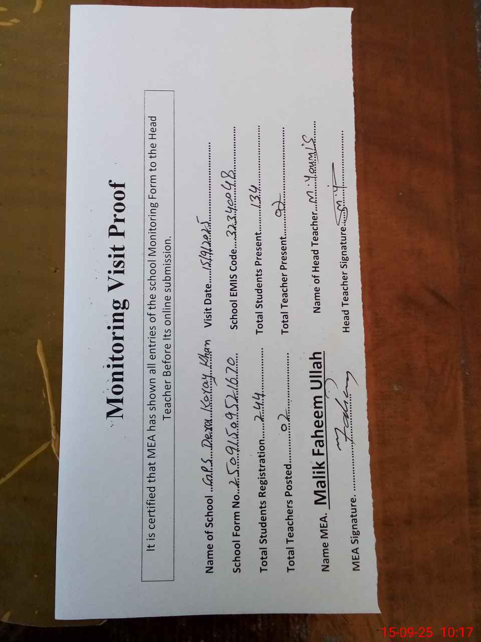 | Attendance Register | Head Teacher | MEA with School | Visit Proof |