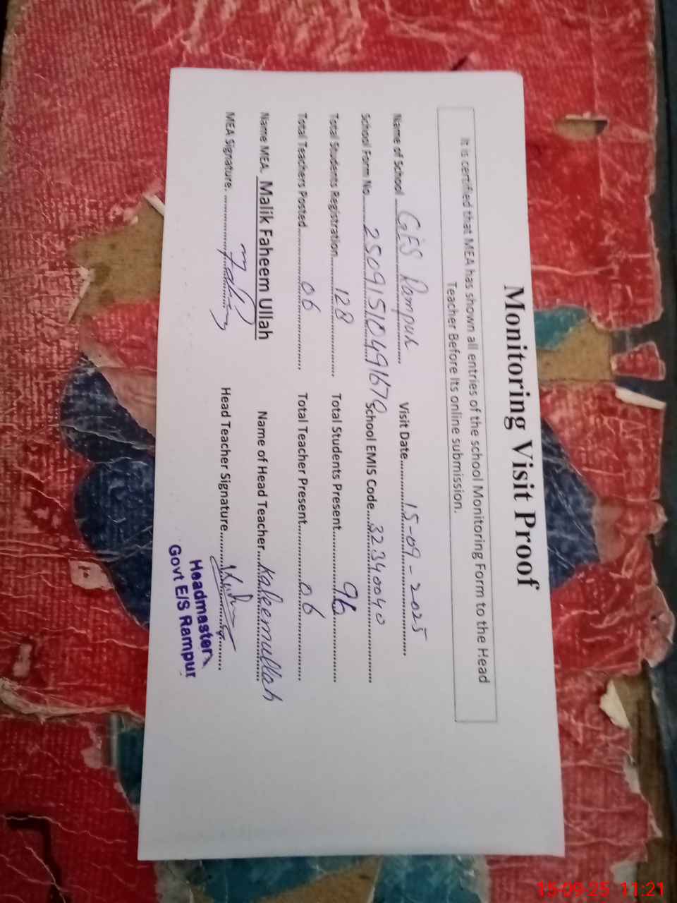 | Attendance Register | Head Teacher | MEA with School | Visit Proof |