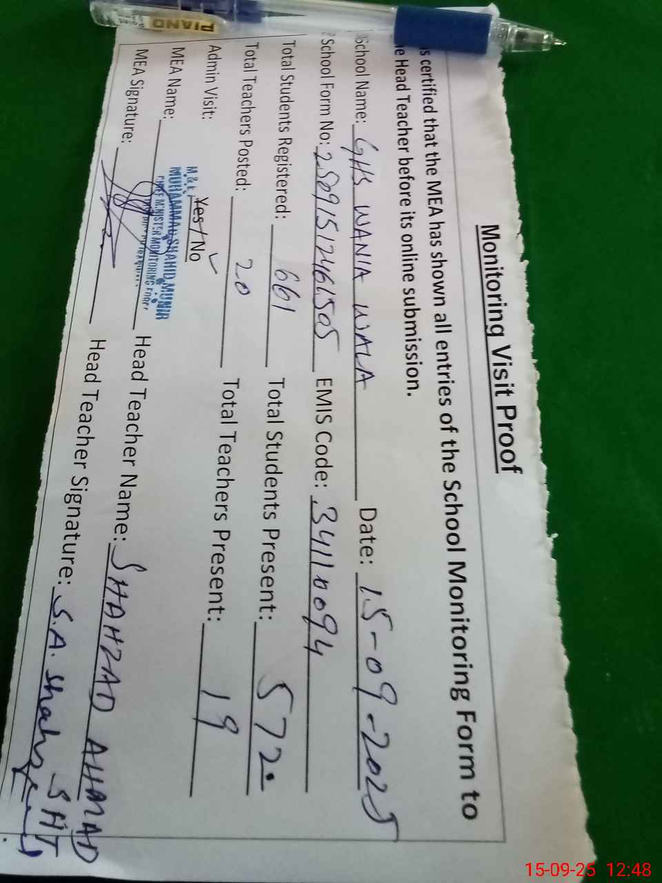| Attendance Register | Head Teacher | MEA with School | Visit Proof |