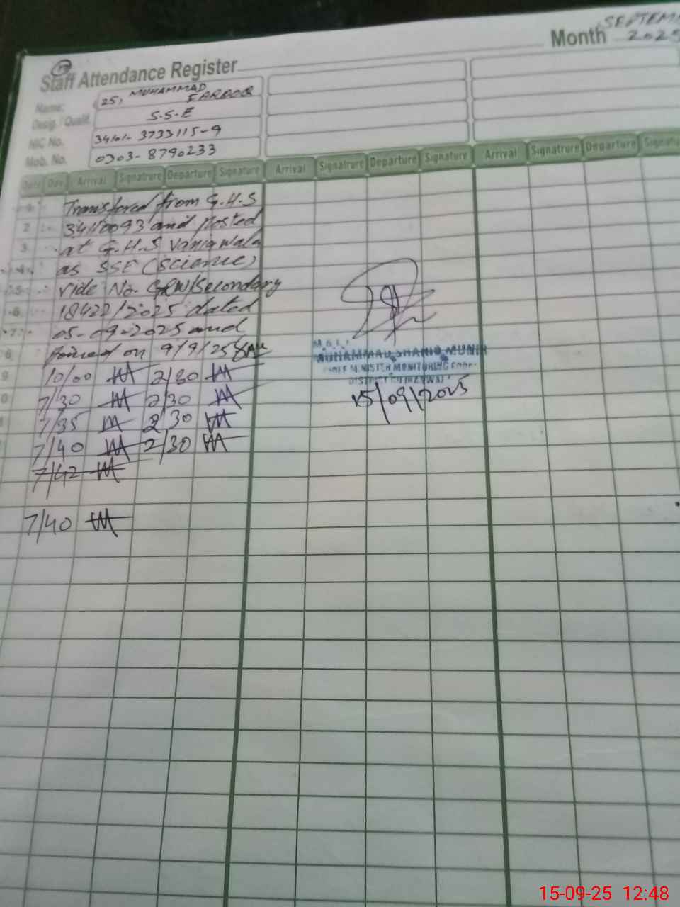 | Name: MU**** BO**** Designation: (School Headmaster's/Headmistress's) SST ARTS Phone/Cell Number: 03**** |