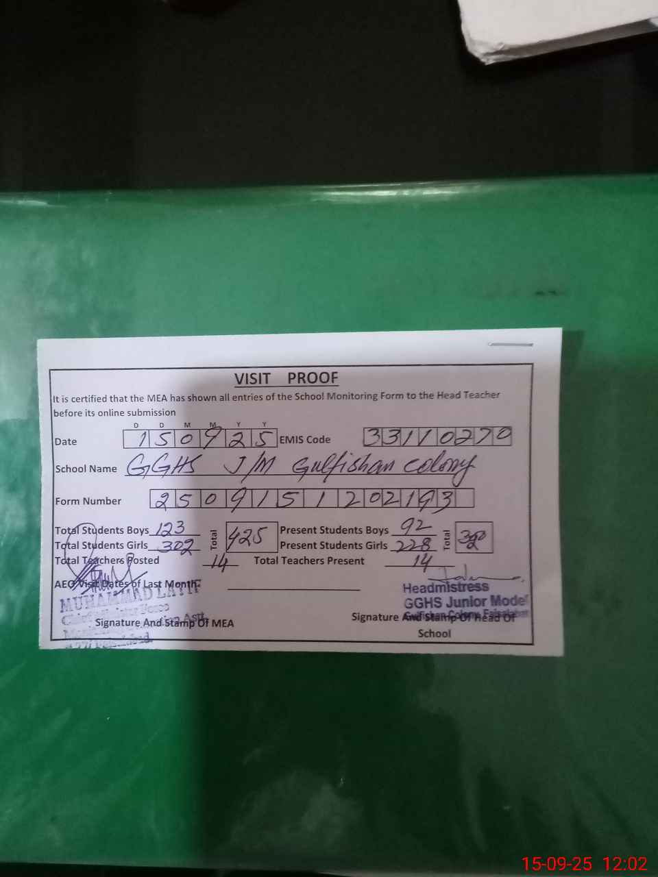 | Attendance Register | Head Teacher | MEA with School | Visit Proof |