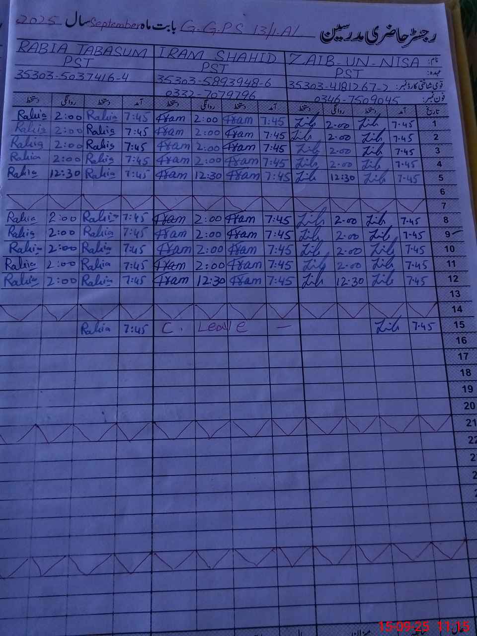 | CNIC | Full Name | Designation | R/C | Absence During Last Calender Month |