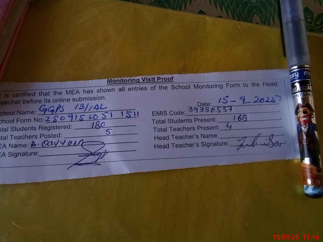 | Attendance Register | Head Teacher | MEA with School | Visit Proof |
